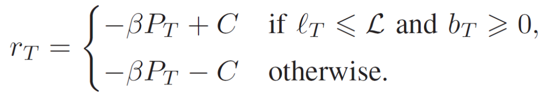 :在本文所描述的问题中,每个 epoch 结束时奖励定义为:r_t=-β P_t,其中β为正则化系数。epoch t 的时间越长,agent 得到的奖励就越少。最后一个 epoch T 的奖励为: