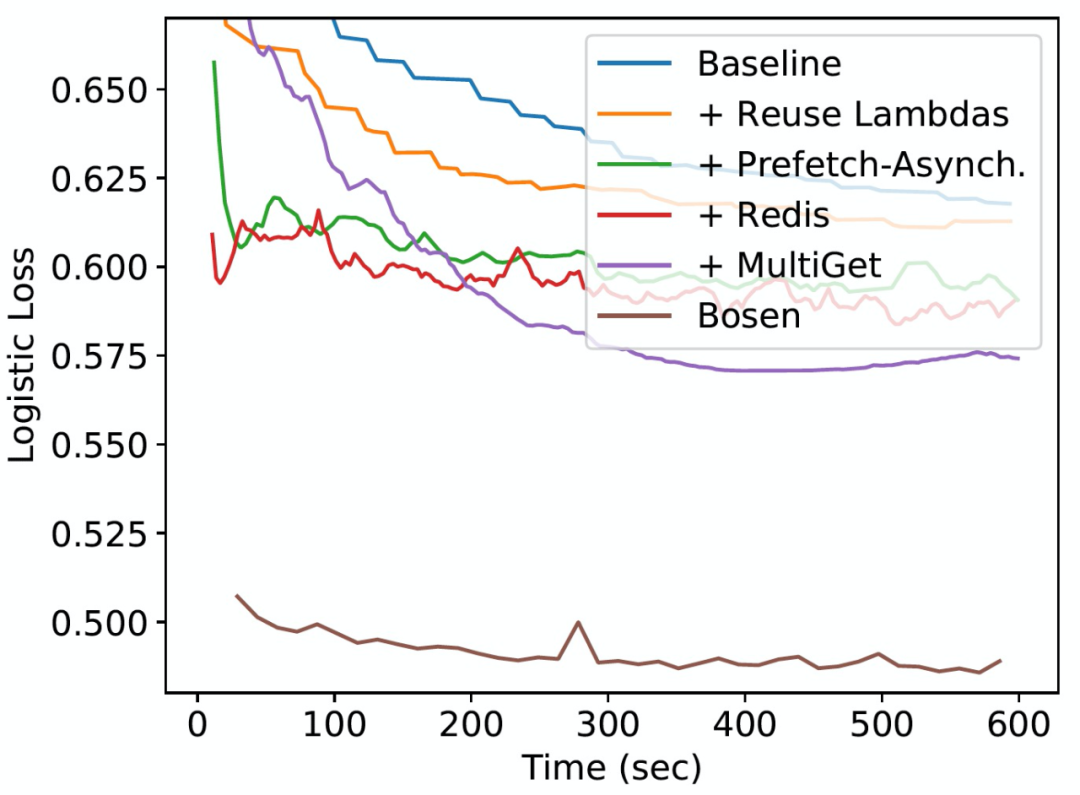 图 2. PyWren 和 Bosen 在 Criteo-Kaggle 逻辑回归任务中的表现。PyWren 基线通过重用 Lambda、添加预取、切换到异步计算、用更高性能的 Redis 存储后端替换 S3 以及支持在单个 RPC 上获取多个密钥而得到了增量改进。