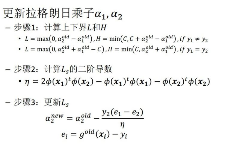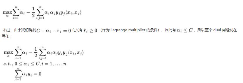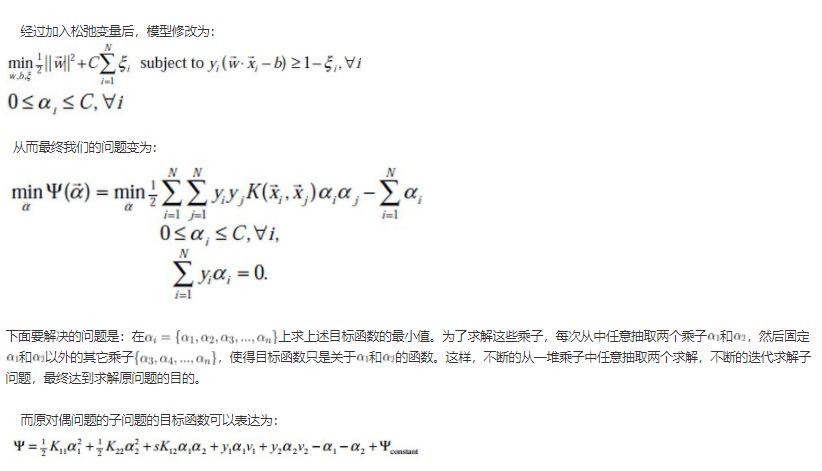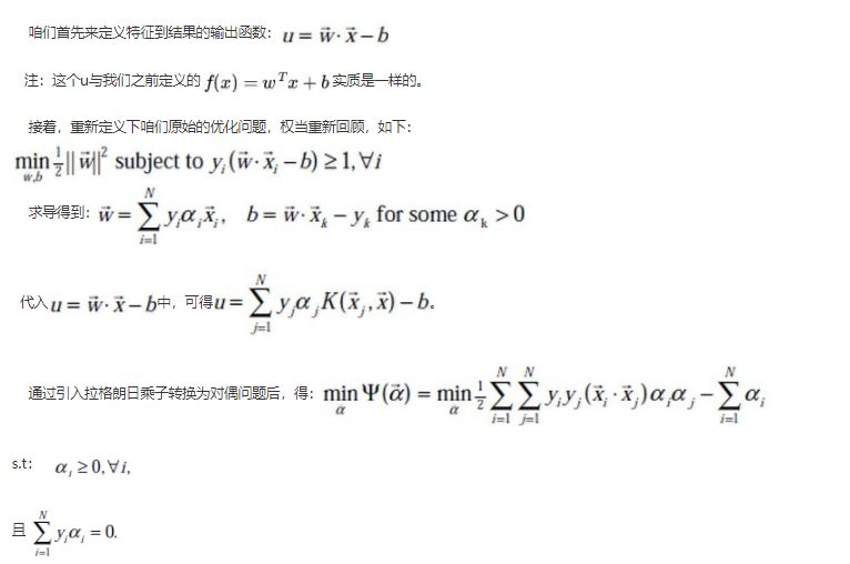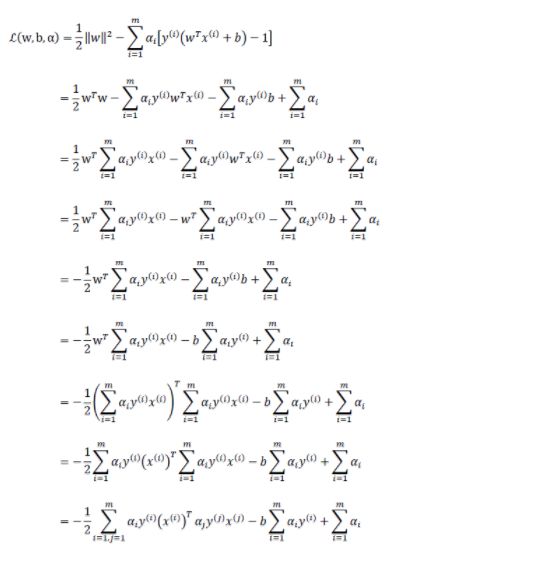 也就是说,原始问题通过满足KKT条件,已经转化成了对偶问题。而求解这个对偶学习问题,分为3个步骤:首先要让L(w,b,a) 关于 w 和 b 最小化,然后求对 α 的极大,最后利用SMO算法求解对偶问题中的拉格朗日乘子。