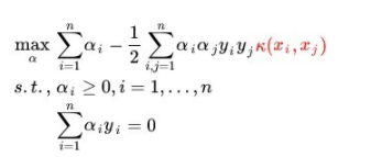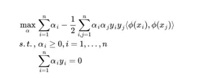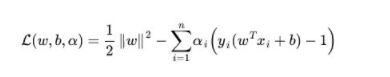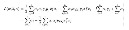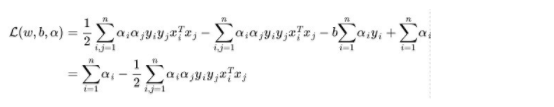 (2)、求 α 对的极大,即是关于对偶问题的最优化问题。经过上面第一个步骤的求w和b,得到的拉格朗日函数式子已经没有了变量w,b,只有 α。从上面的式子得到: