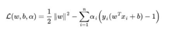 从上面的最后一个式子,我们可以看出,此时的拉格朗日函数只包含了一个变量,那就是 αi(求出了 αi 便能求出w,和b,由此可见,上文第1.2节提出来的核心问题:分类函数
