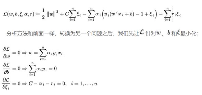 经过论证,我们这里的问题是满足 KKT 条件的(首先已经满足Slater条件,再者f和gi也都是可微的,即L对w和b都可导),因此现在我们便转化为求解第二个问题。