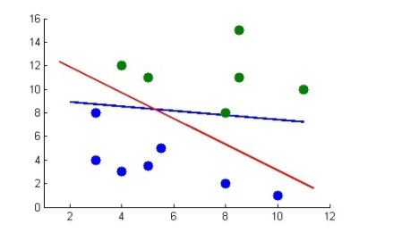 给定一些数据点,它们分别属于两个不同的类,现在要找到一个线性分类器把这些数据分成两类。如果用x表示数据点,用y表示类别(y可以取1或者-1,分别代表两个不同的类),一个线性分类器的学习目标便是要在n维的数据空间中找到一个超平面(hyper plane),这个超平面的方程可以表示为( wT中的T代表转置):