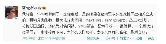 1.“压力”陡增的评论→//@藏了个锋:我是看着July大神的博文长大的啊//@zlkysl:就是看了最后那一篇才决定自己的研究方向为SVM的。--http://weibo.com/1580904460/zraWk0u6u?mod=weibotime。