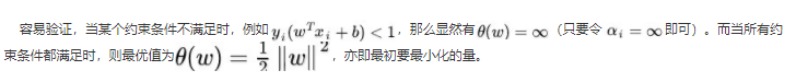 ,实际上等价于直接最小化θ(W)(当然,这里也有约束条件,就是αi) ,因为如果约束条件没有得到满足,θ(W)会等于无穷大,自然不会是我们所要求的最小值。