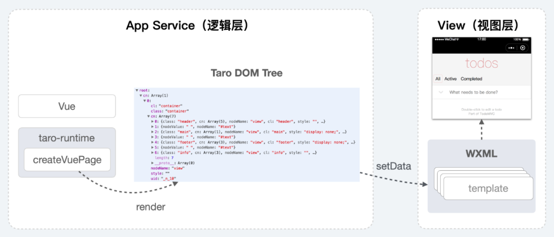 在 Taro 中使用 Vue 也是一样的,通过调用 createVuePage 创建 DOM Tree 之后就可以实现打通整个流程。