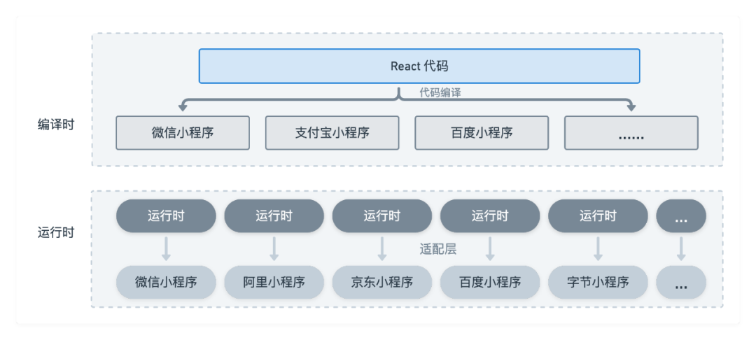 就像这个架构图显示的一样,我们通过 AST 解析开发者的 React Like 代码,转换成对应端的小程序代码,通过适配层就可以完成所有小程序的适配。虽然一句话就可以讲完我们所有的工作,但是其中的困难很多都难以想象,我们发现维护框架的成本逐渐超出了我们可以接受的极限,所以我们选择向前再迈出一大步。