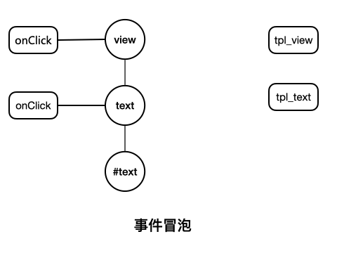 以基础的 click 事件为例,当小程序中 tpl_text 节点触发事件时,框架会通过 Taro DOM Tree 提供的 getElementById 方法找到 text 上的 onClick 方法找到相应的事件并触发。