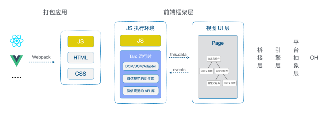 最终就可以看到我们写的代码可通过 webpack 打包成应用,在前端框架层通过 Taro 提供的运行时与 UI 视图交互数据和事件,加上 OH 提供的基础能力就可以为鸿蒙端适配渲染。