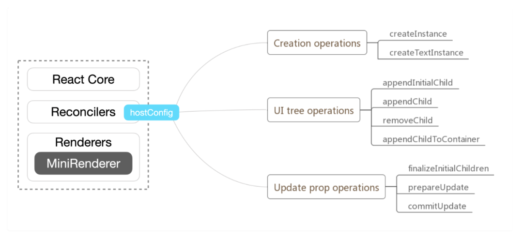 当生命周期对齐,页面只要渲染出来就可以了,当然这里每个框架会有些不同。以 React 为例,ReactDOM 作为渲染器,功能非常丰富,但包体很大而且并非所有都在小程序中需要用到,选择使用 react-reconciler 自定义渲染器精简是个很容易做出的决断,加上 hostConfig 注入对应的依赖, taro-react 就完成了。