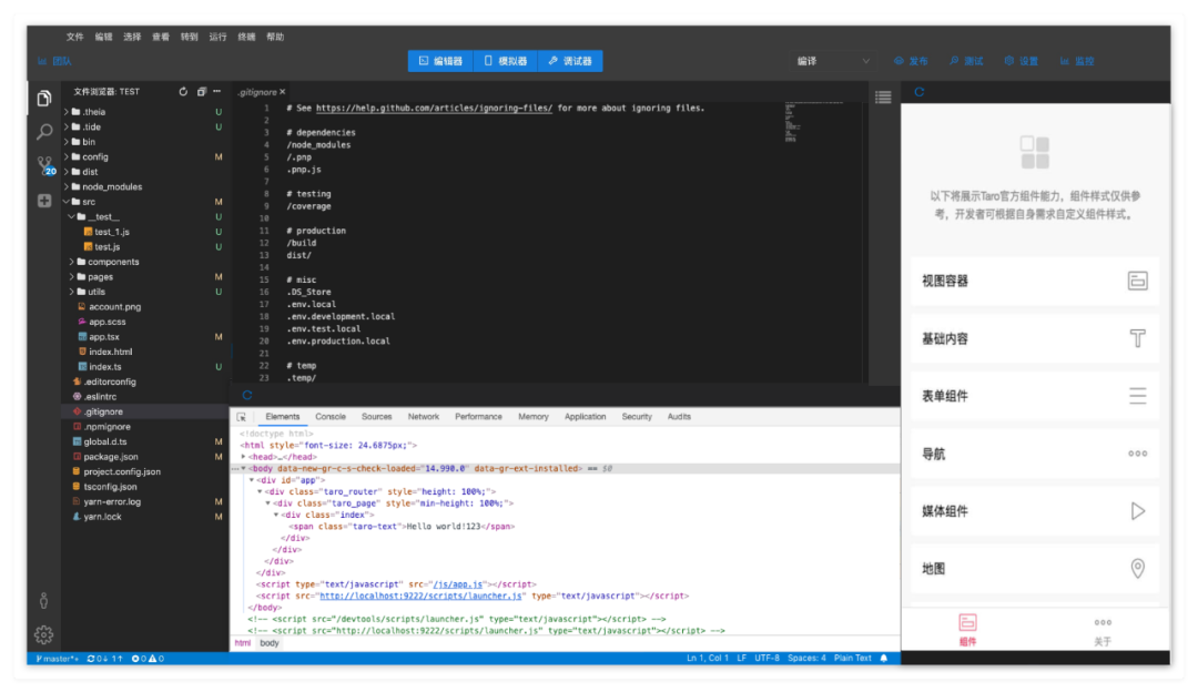 Cloud IDE,也就是 Tide 项目,也倾注了我们团队很多成员的心血,通过内置的 Taro 研发流程,很好地解决了在小程序开发过程中的诸多痒点,比方说模板、插件管理,多端配置差异,版本管理等等工程化的问题。