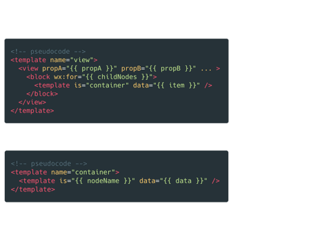 通过模板的一一对应,我们就能完成所有组件的渲染,但不同平台的模板功能是差异化的,有的支持递归,而有的并不支持,这也就分成了两种不同的小程序类别。比方说阿里、头条、百度的小程序都支持递归,我们可以让模板自我调用来避免重复。