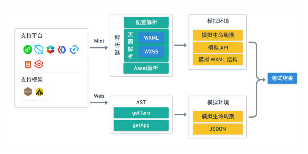 测试沙箱作为一套自研的方案,可以完全适配全平台的小程序和 Web 端的逻辑测试,通过模拟小程序的 DOM 结构、生命周期和 API 来辅助开发者完成小程序相关的能力测试;在 Web 端则是通过解析生成代码的 AST 获取应用和 Taro 实例,结合 Jsdom 模拟实际的浏览器环境,达成和小程序一致的测试体验。
