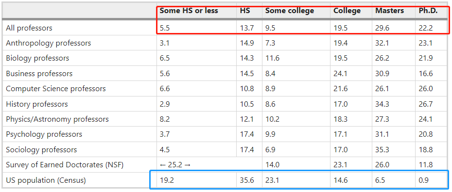 相比之下,在与这些教授出生时间一致的美国成年人中,平均只有不到1%的人拥有博士学位,只有7.4%的人拥有研究生学位。