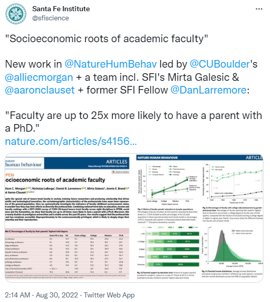 在这篇名为《Socioeconomic roots of academic faculty(学术教师的社会经济根源)》的论文中,研究人员调查了7204名美国大学终身教授,统计了他们童年时期父母的社会经济地位(SES)和父母最高教育水平等信息,并与同一时期的一般人口模式进行对比。
