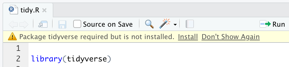 RStudio 1.2 会自动检查代码中调用但机器未安装的package,并提供一键安装的功能。