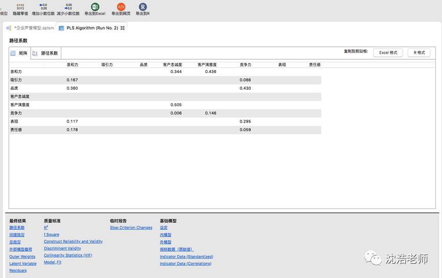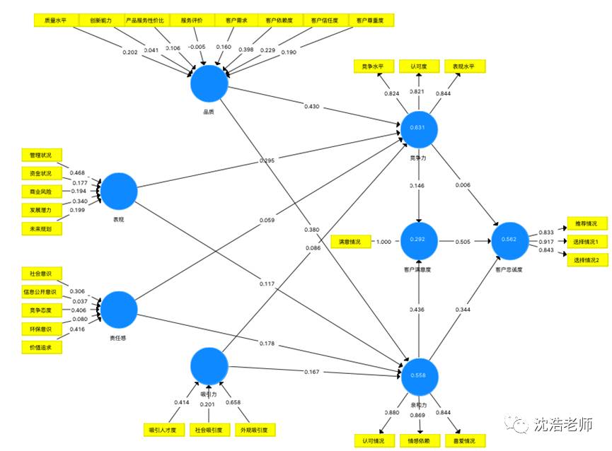 回到模型界面,我们可以更直观的观察数据。箭头上的数字表示权重,潜变量内的数字表示R2。