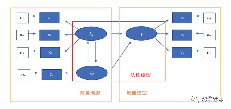 如图所示:其中,X1……X4、Y1……Y3表示观测变量,ξ1、ξ2是潜在的外生变量,η1是潜在的内生变量,e1……e7表示与观测变量相关的误差(error)项