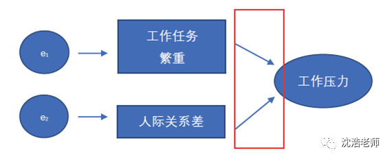 然而,有些时候,潜变量的意义是由测量变量来决定的,这一类测量模型就称为形成性测量模型(Formative Measurement Model),所对应的测量变量即为形成性指标(Formative Indicator)。举个例子:工作任务繁重,人际关系差等造成了工作压力。