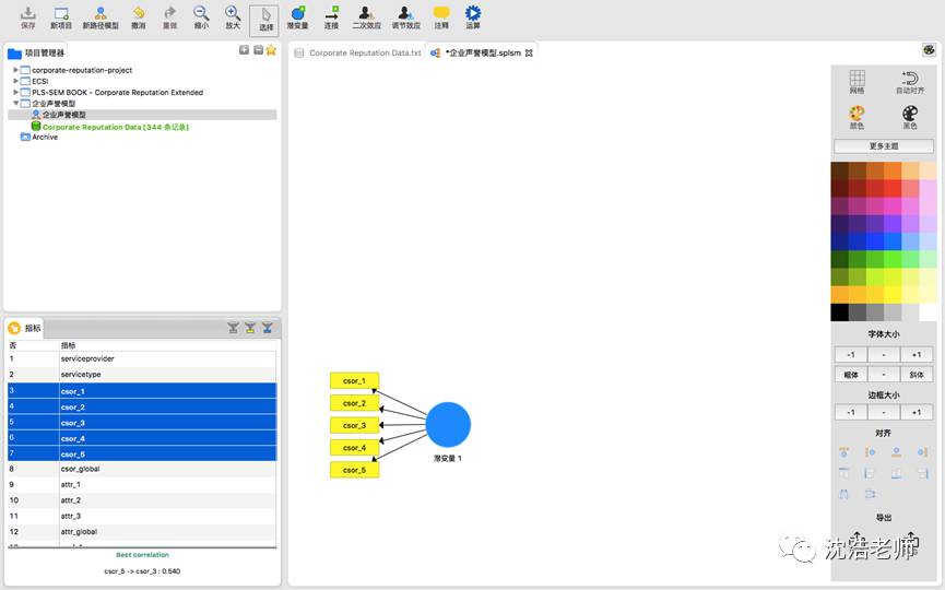 数据导入完整后开始建模,选中csor(责任感)的5项指标并拖动到建模界面中,可得一个潜变量建构。
