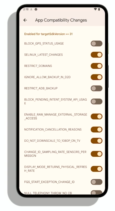您可以使用以下 adb 命令列出系统已知的所有兼容性变更 (包括已启用和禁用的变更) 及其当前的启用情况。列表中的每项变更都有名称、供引用的变更 ID 和启用/禁用状态。