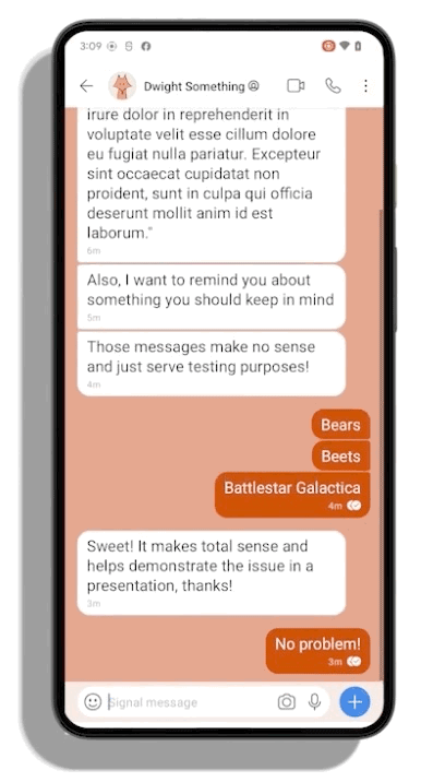 我们为 Android 12 正式版及时修复了过度滚动的问题并为用户提供了统一的体验。 Signal Private Messenger