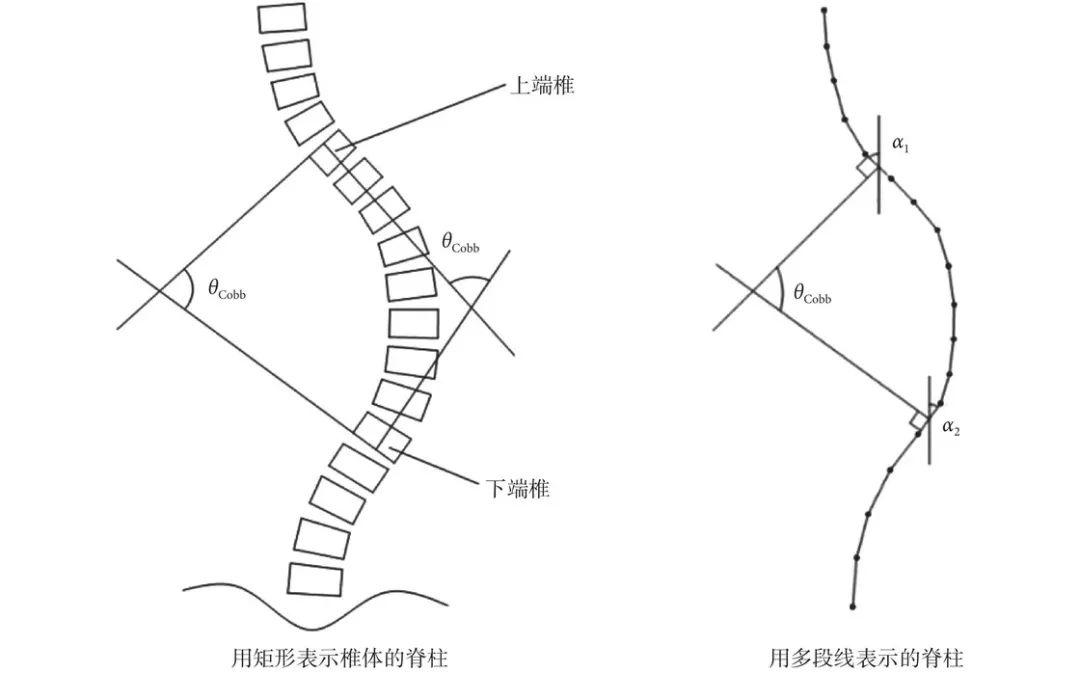在这个定义中有一个陌生的概念 Cobb 角,我们不需要知道 Cobb 的详细计算方式,只需要知道 Cobb 角是衡量脊柱侧弯程度的一个关键指标即可。下图展示了 Cobb 角计算示意图。
