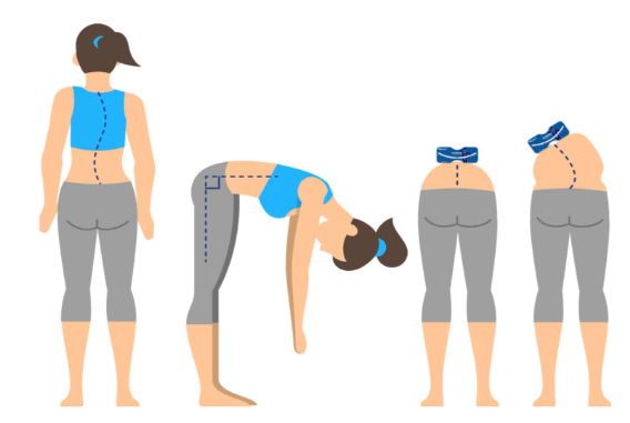 具体来讲,我们可以弯弯腰,伸展下背部以及身体向左右侧屈和旋转,且重复两次。这一整套流程叫做脊柱运动实验。进行脊柱运动实验后,再次使用脊柱侧弯测量仪进行测试,评估脊柱侧弯结果。