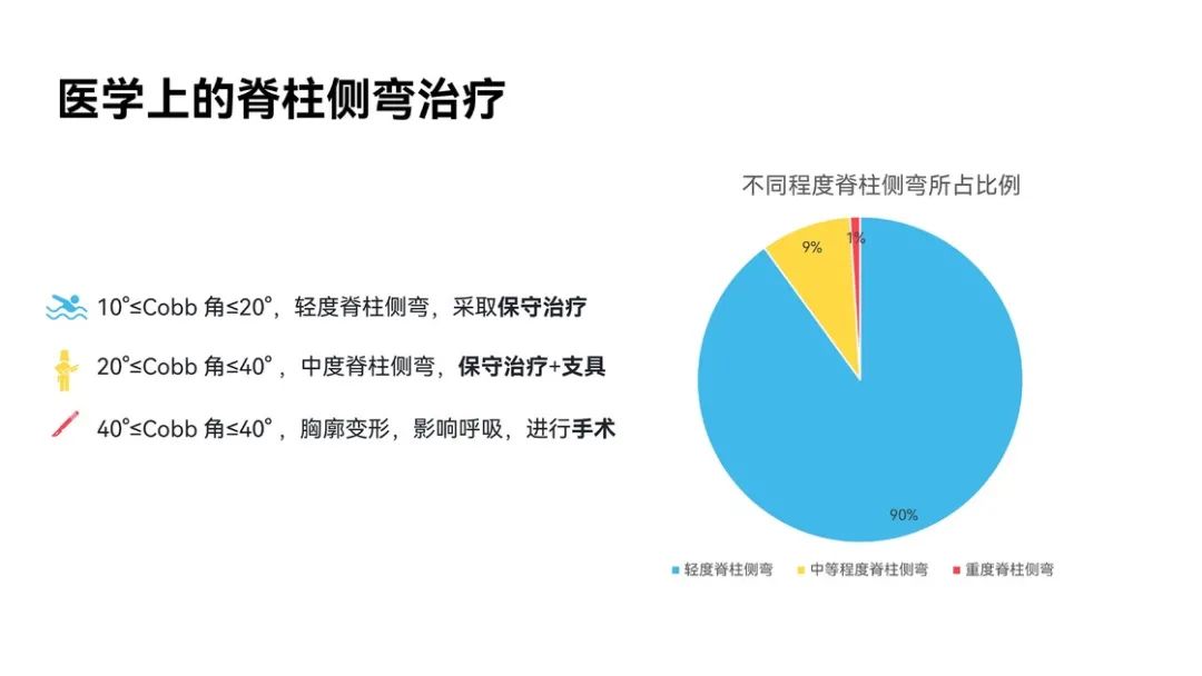 通过上面对于脊柱侧弯的定义我们可以了解到,并不是脊柱发生弯曲就叫做脊柱侧弯。在 Cobb 角没有超过 10° 的时候,在医学上是不能确诊为脊柱侧弯的。明白这一点非常重要,因为这两种脊柱侧弯的危害以及治疗手段迥然不同。明白这一点,你也能理解为啥你觉得脊柱发生了侧弯,去医院,医生却没能给你进一步治疗,只是让我们注意平时的生活方式。因为我们的脊柱侧弯还没达到医学上脊柱侧弯的标准。为了便于沟通, 我们将 Cobb 角大于 10° 的脊柱侧弯称作