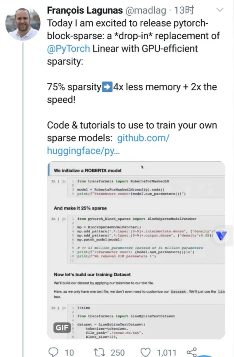 不过,框架的开发者们并没有停下他们的脚步,就在不久前,HuggingFace开心地宣布,他们可以支持稀疏矩阵运算啦!75%的sparsity换来了1/4的内存和2倍的速度提升!