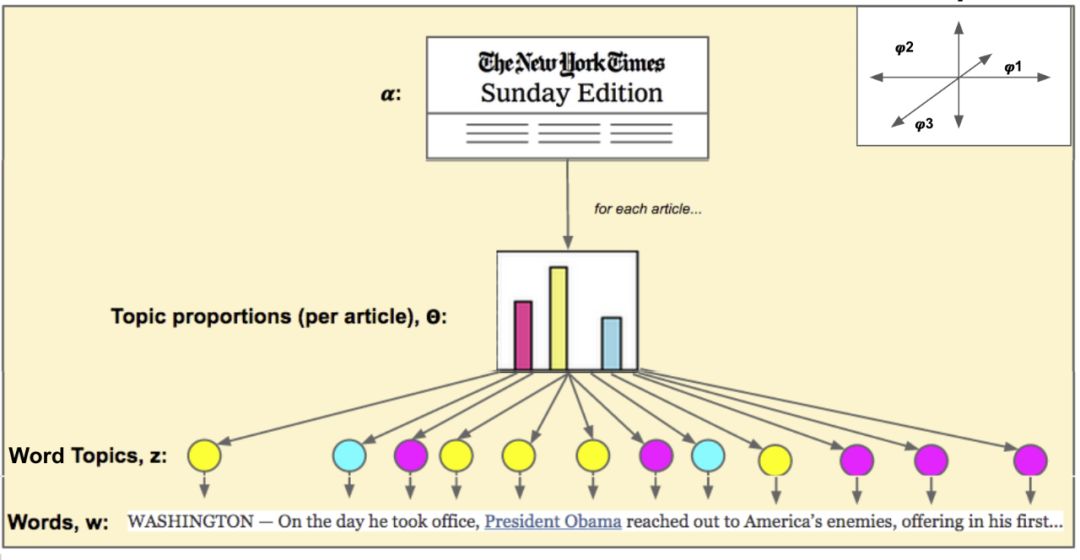 以《纽约时报》为例。首先,对于每个新闻文章,我们对整个文档的主题分布θ_i_进行采样。对每个主题中词的分布φ_k_进行采样。然后,对于每个文档中的词j,我们从给定的主题分布Multinomial(θ_i)中得到一个主题z_ij,然后从给定的词的分布Multinomial(φ_z_ij)中的到w_ij,并基于w_ij采样得到一个单词。这个过程通过下面的图来表示。