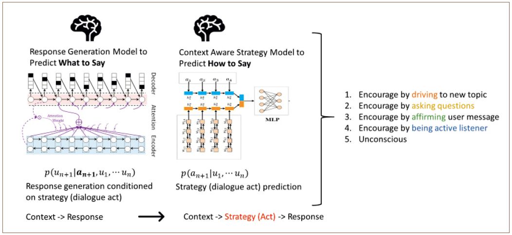 然而,用户在与小冰对话时也常会感受到压力。比如两者间的对话总是需要人类来提出话题,小冰来回应。就好像我们与感兴趣的异性搭讪,如果总是自己主动、对方被动,对话就会变得淡乎寡味、如同鸡肋——共感模型的开发就是针对这一状况。共感模型可以帮助小冰自行判断对用户的话题是否有感,在此基础上,小冰将会主动求证,进而引导话题的方向,增添新的聊天内容。这样就减轻了用户的压力,同时增加了聊天的自然度和趣味性。从学术的角度,武威博士提出的共感模型(如图1所示)把“说什么”的问题在逻辑上拆成了两步:由上下文决定“怎么说”的策略;根据策略和上下文来决定具体“说什么”。