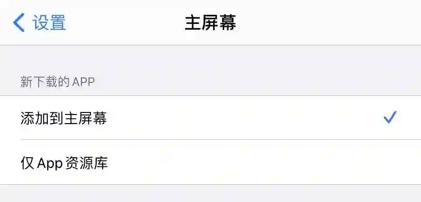 如果你想让应用在下载直接添加至 App 资源库,那么可以在「设置 - 主屏幕」中将「新下载的 App」更改为「仅 App 资源库」。你之后下载的所有应用都会直接被放入 App 资源库,不会出现在主屏幕上。