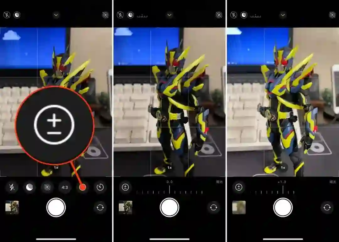在 iOS 14 中,你只需要向上滑动屏幕即可呼出摄影菜单,点击有加减号的按钮即可打开曝光控制。在这里左右滑动调整的曝光补偿会被锁定住,不会根据光线变化而自动调整。