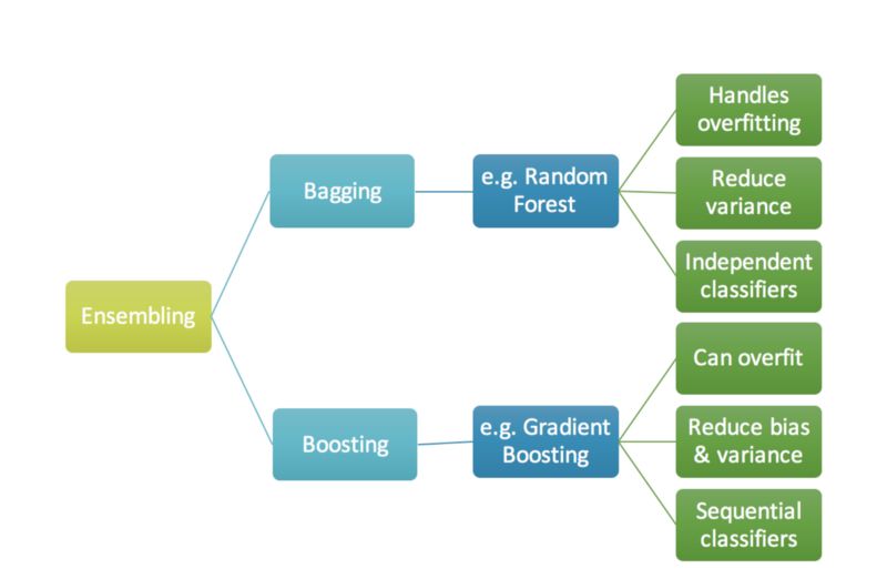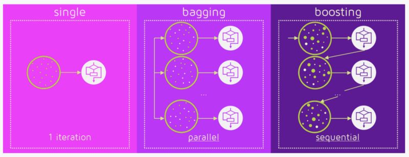 Fig 2. Bagging (independent models) & Boosting (sequential models). Reference: https://quantdare.com/what-is-the-difference-between-bagging-and-boosting/