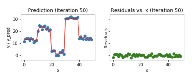 我们发现,即使是50个迭代之后,残差vs. x的图和我们看到的20个迭代的图也没太大区别。但是模型正在变的越来越复杂,预测结果在训练数据上出现了过拟合。所以,最好是在20个迭代的时候就停止。