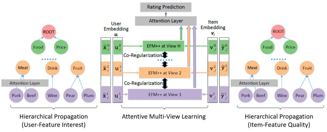 能否构建一个深层的网络,每一层的特征和它们之间的关联都是可解释的呢?沿着这个思路研究,我们利用Microsoft Concept Graph构建了深度可解释网络的初始结构,并且利用Attentive Multi-View Learning对这个深度可解释网络中每层的参数进行优化,使它不仅可以提高推荐准确性、有用性,还可以通过无监督的方式自动对用户的层次兴趣进行建模。例如,我们可以知道用户是只对寿司(低层特征)感兴趣,还是对日料(高层特征)整体都比较感兴趣。这部分工作我们发表在AAAI 2019论文《Explainable Recommendation Through Attentive Multi-View Learning》中,模型框架如下图所示。