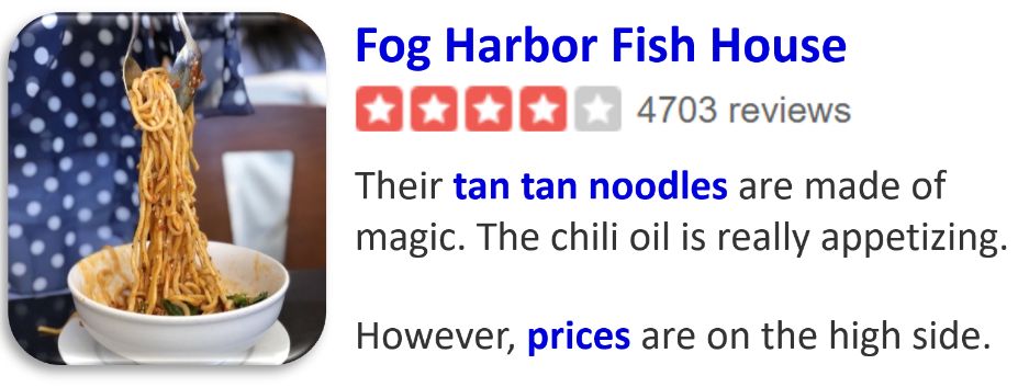 下图是一个偏重解释有效性的例子。和偏重说服力的相比,它不仅会突出餐馆值得一去的原因(担担面好吃),还会指出餐馆的一个缺点(价格偏高),帮助用户做出更好的决定。