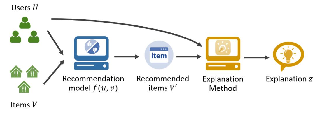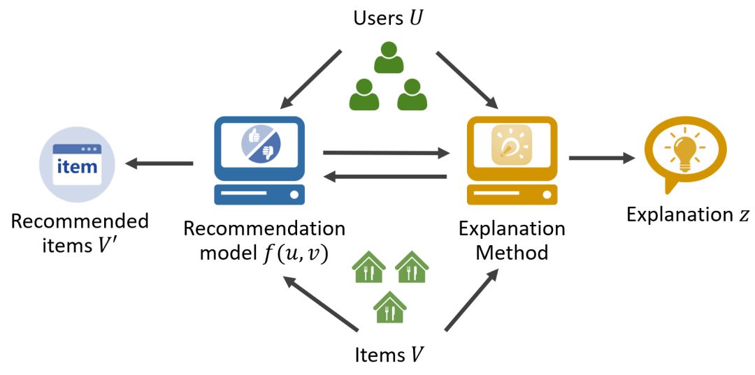 下面,我们回归到可解释推荐的场景下,看看现在可解释方法的主要流程是什么样的。这些流程里面主要涉及到推荐中的几个关键要素:用户集合U、物品集合V、被解释的推荐系统f(u,v)、推荐系统的推荐物品集合V',解释模块以及其输出的解释z。