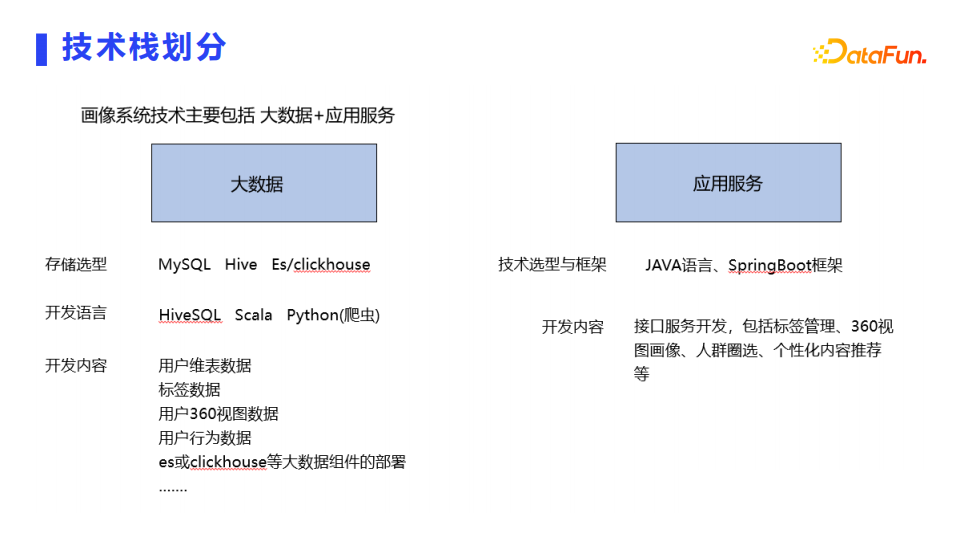 画像系统技术主要包括大数据+应用服务。大数据从存储类型、开发语言、开发内容来了解;应用服务从技术选型与框架、开发内容来了解。