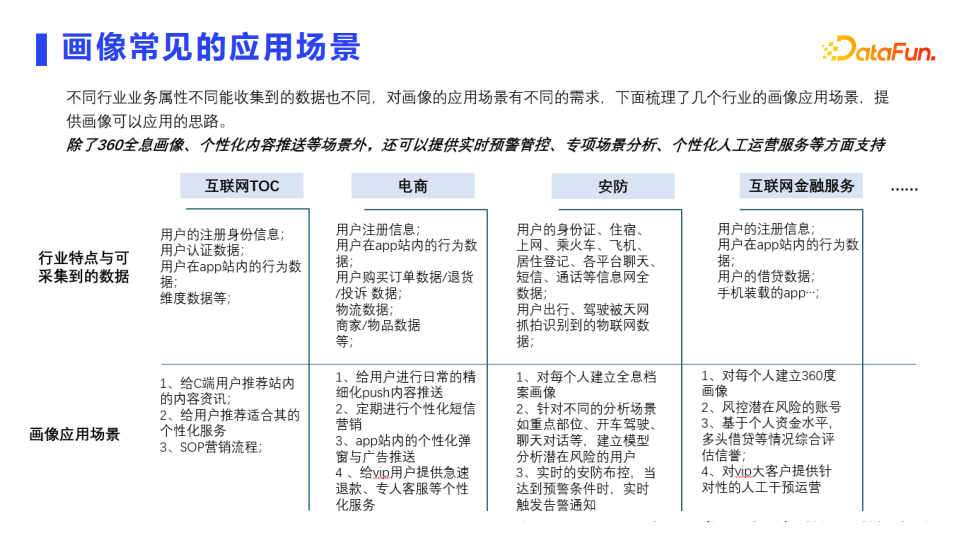 不同行业业务属性不同,能采集到的数据源也不同,对画像的应用场景有不同的需求,下面梳理互联网 TOC、电商和安防等行业的画像应用场景,提供画像应用思路。