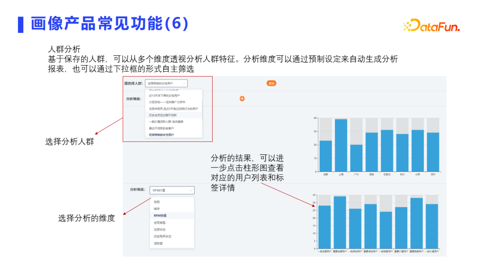 人群分析:可以从多个维度透视分析人群特征。分析维度可以通过预制设定来自动生成分析报表,也可以自主筛选。选择分析人群、选择分析的维度、分析的结果,可以进一步查看对应的用户列表和标签详情。