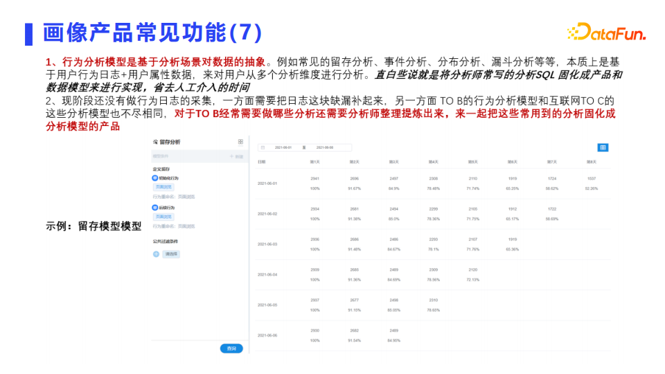 常见的360全息画像,就是给一个人打完全部标签之后,输入ID可以返回这个人的全部标签,看到这个人的全息画像,然后基于标签做个性化内容推送和消息推送,以及提供实时管控预警、专项场景分析。比如我们常见的事件分析、漏斗分析等数据分析模型,其实都是基于标签和行为数据,把数据模型产品化之后做成的特定场景分析,提供个性化的运营服务支持。