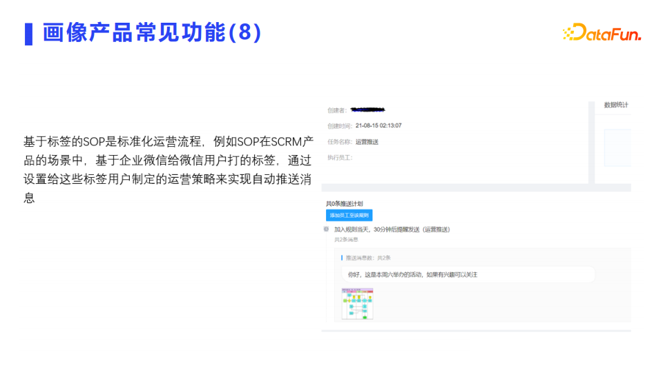 基于标签的SOP是标准化运营流程,例如SOP在SCRM产品的场景中,基于企业微信给微信用户打的标签,通过设置给这些标签用户制定的运营策略来实现自动推送消息。