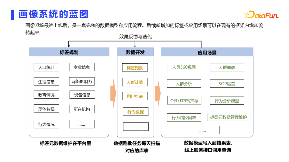 应用场景:开发完数据后,再推送到应用场景,包括人员360视图、人群圈选、人群分析、SOP运营、内容推荐等场景。我们基于应用场景做迭代效果反馈之后,再反馈给标签规划以及数据开发,再优化数据标签以及数据开发的流程,这是整个应用的蓝图。