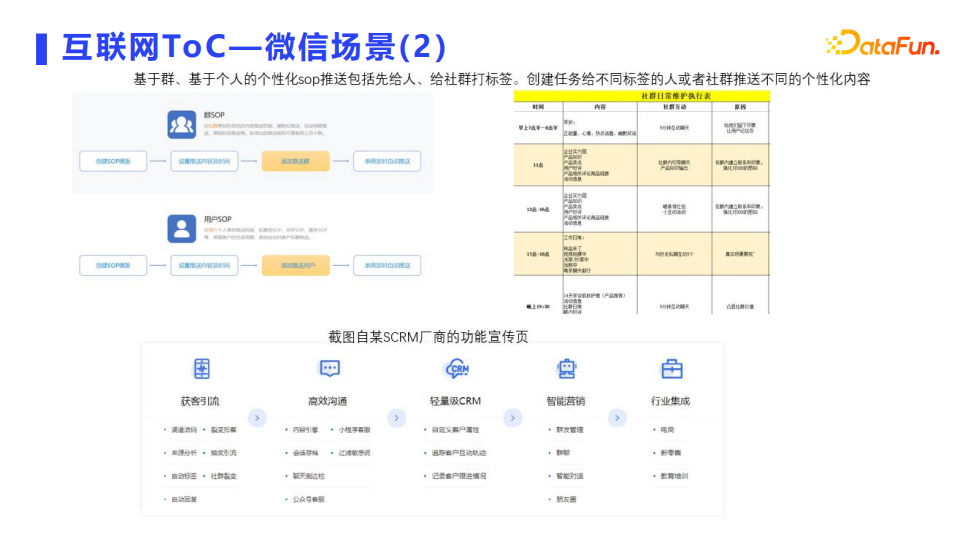 这里截图了某SCRM厂商的功能宣传页,我们都知道CRM是客户关系管理,SCRM就是Social CRM。