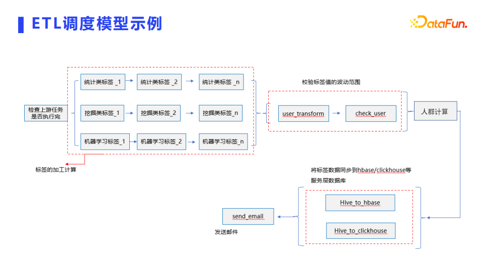 ETL调度模型包括标签的加工计算、数据标签的校验、人群计算、跑一些分析宽表。跑完数据模型后,推荐到线上服务层,比如Redise、Clickhouse、ES ,分到服务层做服务的调用,包括站内的服务调用以及TOC的客户端服务调用。
