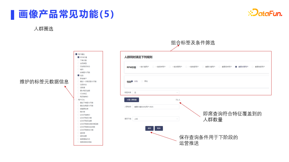 基于标签组合及标签的规则定义进行人群圈选,即基于维护的标签元数据信息、组合标签及条件筛选、即席查询符合特征覆盖到的人群数量、保存查询条件下用于下阶段的运营推送。
