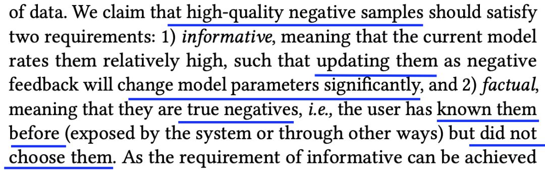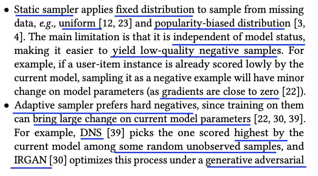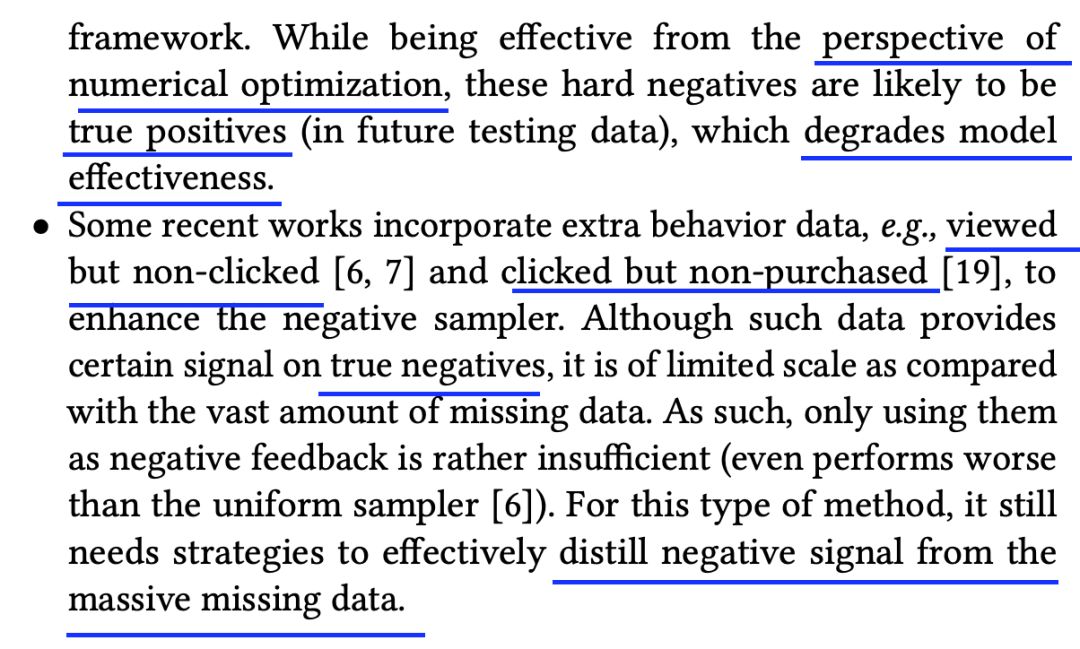 。但是,目前的负采样策略,无论是静态负采样还是自适应负采样,都无法得到高质量的负样本,这些负样本对辅助模型训练和反应用户真实需求方面的能力都有所欠缺。