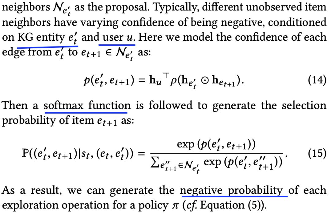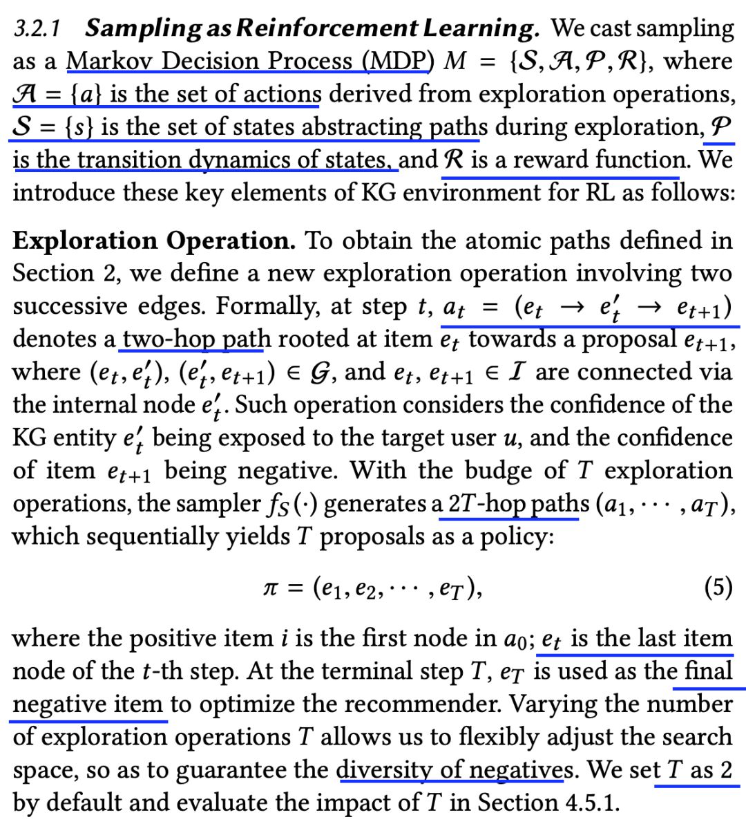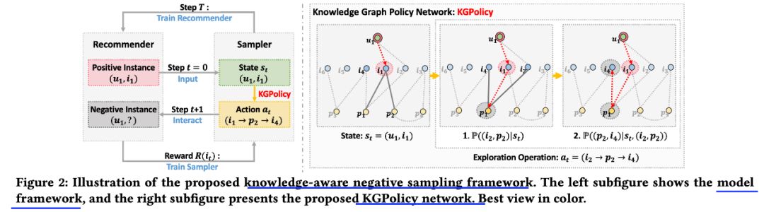 为此,作者们提出一种新的负采样模型,知识图谱策略网络(KGPolicy),以强化学习智能体的形式来探索高质量负样本。具体而言即为,通过设计适当的探索操作,该模型从目标正样本的交互中自适应接收带有知识的负样本信息,最终产生潜在的负样本商品来训练推荐模型。